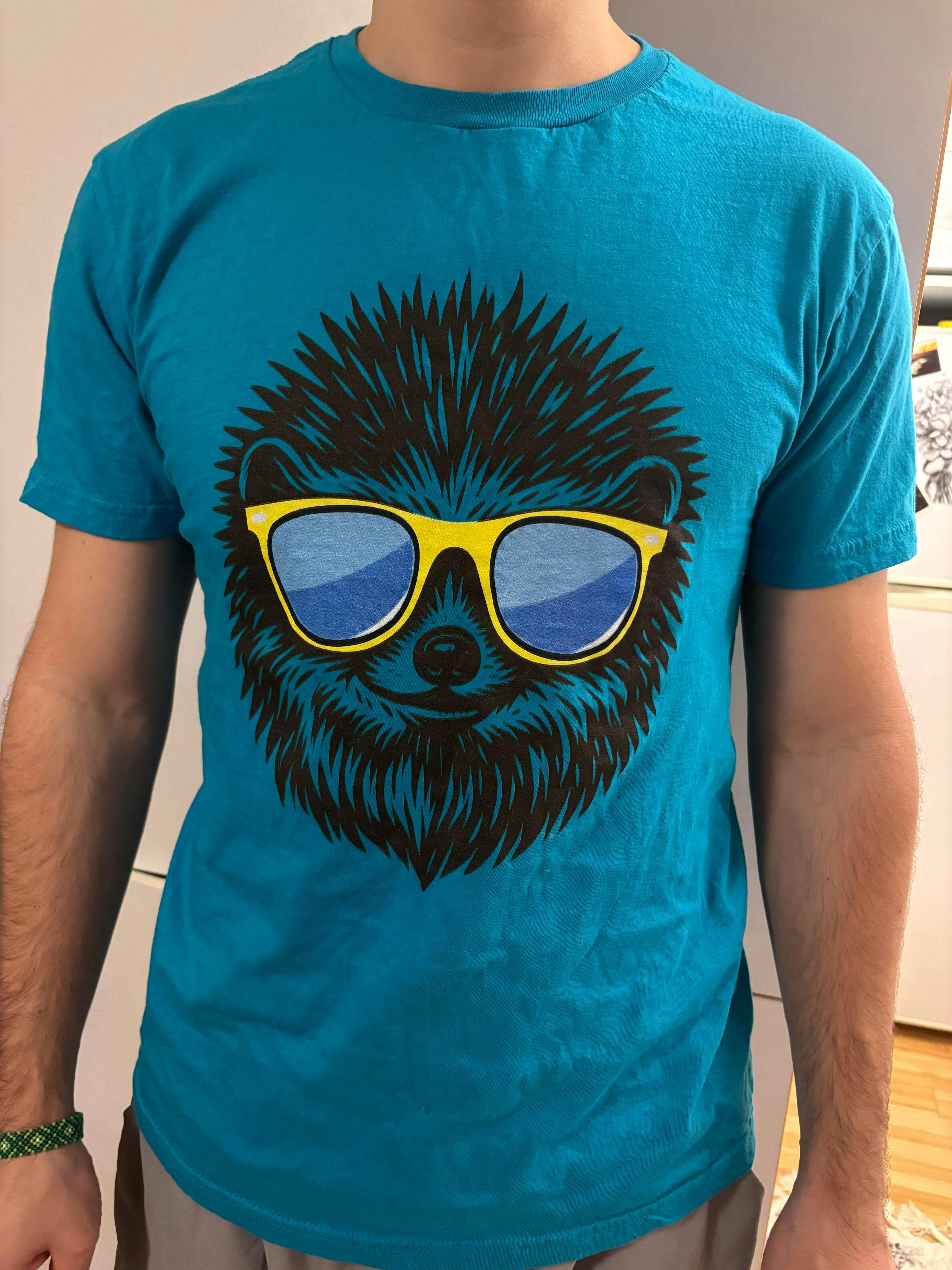 Lightweight, breathable, and soft against the skin — this classic crew tee brings a wink of personality to everyday wear. A detailed hedgehog face, sketched with fine black lines and finished with bold yellow sunglasses and sky-blue lenses, sits at the chest and reads playful without being loud. Wear it on lazy weekends, out on a casual coffee run, or layered under a jacket for a relaxed, creative look. The smooth ring-spun cotton feels comfortable all day; the ribbed collar and shoulder tape keep the shape after repeated wear. For those who love subtle charm and hand-drawn style, this shirt adds a touch of humor and warmth to ordinary routines.